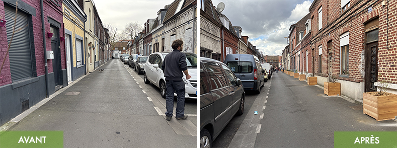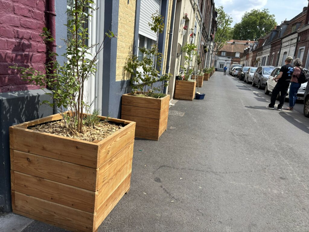 La rue accueille désormais plantations, bacs végétalisés et espaces de pleine terre en bord de façade installés avec les habitants. Le végétal y reprend sa place et adoucit l’ambiance urbaine.
