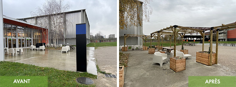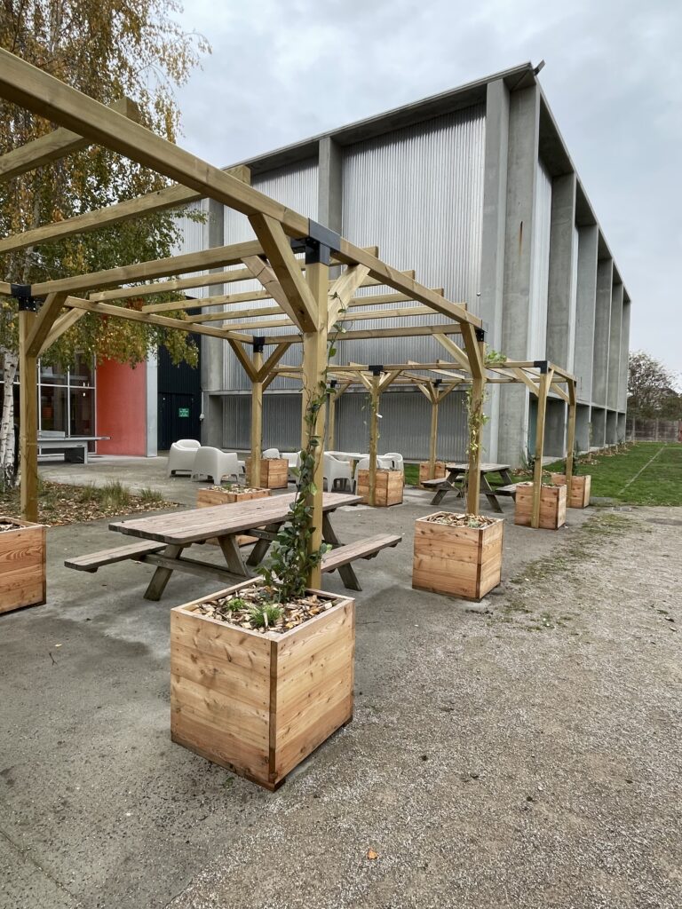 Végétaliser l’espace buvette avec des pergolas plantées et des bacs paysagers.